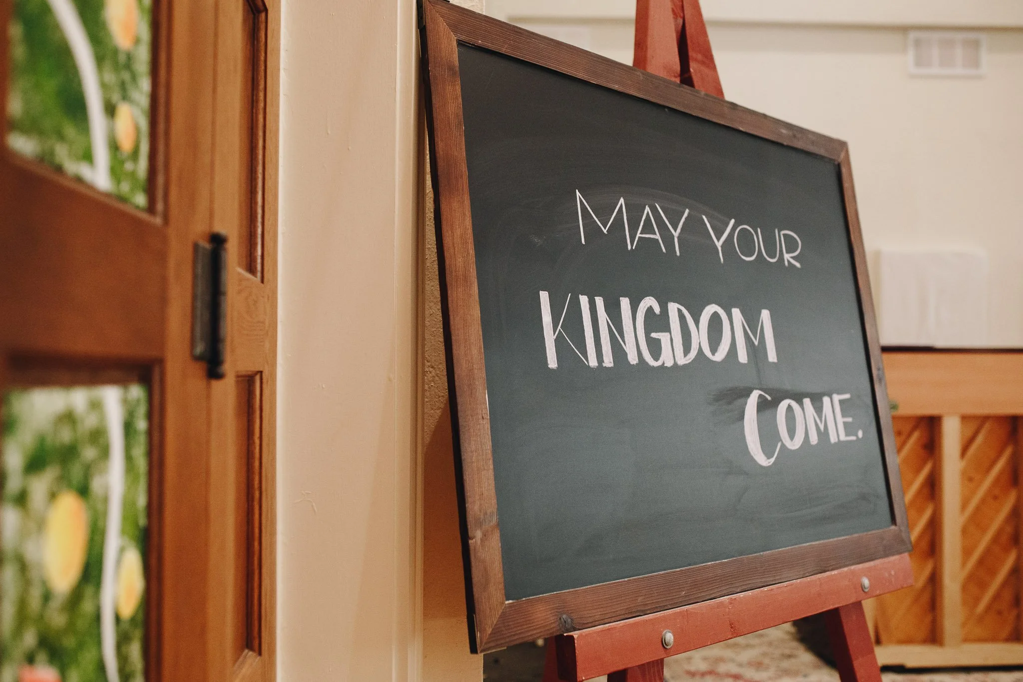A chalkboard sign on an easel with the message 'May your kingdom come' written on it in white chalk, positioned indoors near a wooden door.
